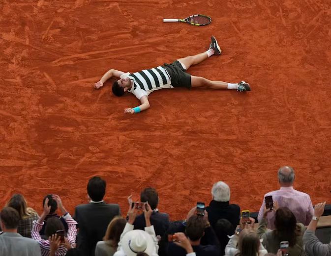 La Chatrier corona su firmamento con una inscripción que unos atribuyen a Roland Garros y otros a Napoleón, dos combatientes que lucharon hasta la muerte por sus objetivos: “Victory belongs to the most tenacious”. En el foso, entre el barro de los campeones, una huella diestra de una 44 europea se ancla al margen izquierdo de la red para recordar a quien ha llevado esa cita al paroxismo deportivo. Carlos le saca una foto y la mira de soslayo, para saber qué hacer cuando se agota el oxígeno. En una de las perserverancias más famosas de Nadal, en Australia 2022, el de Manacor superó dos sets en contra y tres bolas de break para firmar una remontada impensable. En la tarde de ayer, Carlos levantó dos sets en contra, break abajo en el tercero y tres puntos de partido en el cuarto. Un antológico sinsentido.